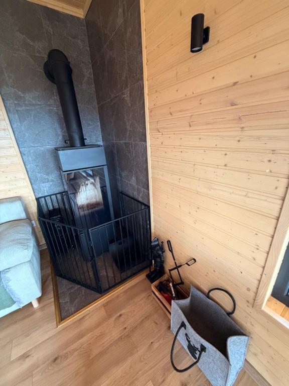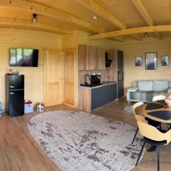 La parter, cabana pune la dispoziție un living generos cu vedere la munte și sobă de tip șemineu cu 2 laturi vitrate, dotat cu canapea extensibilă (150×190 cm, pentru 2 persoane) și un grup sanitar.