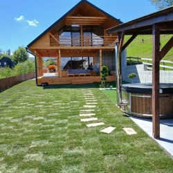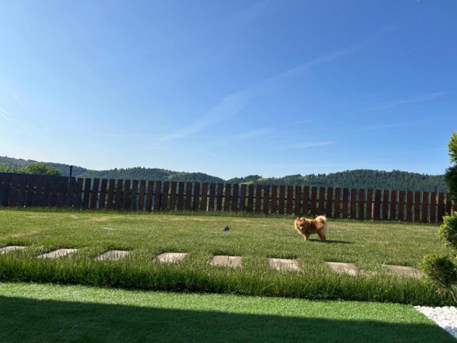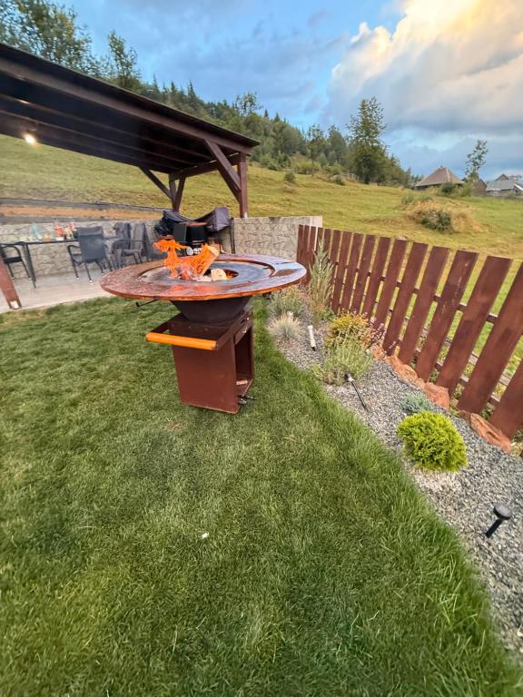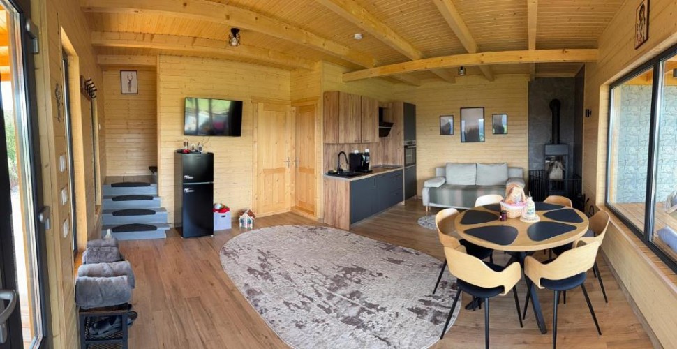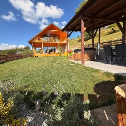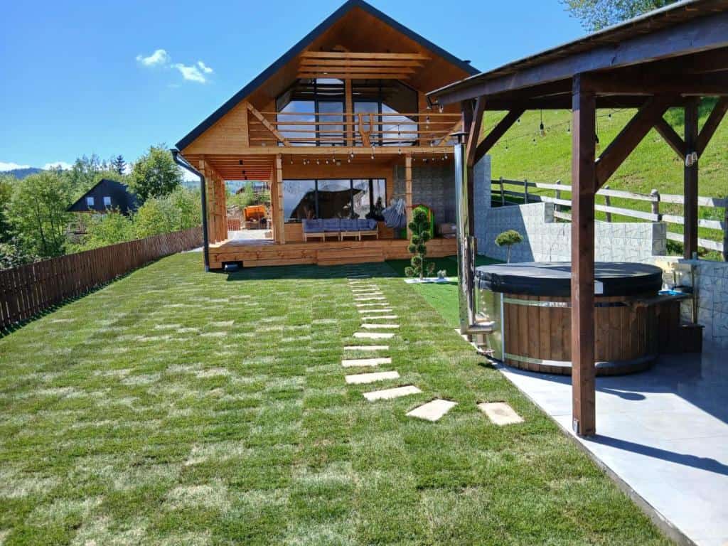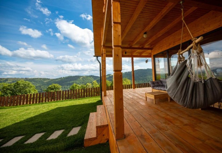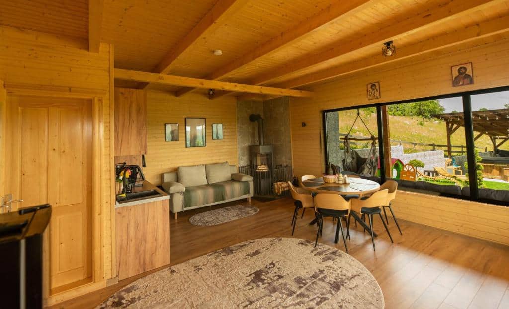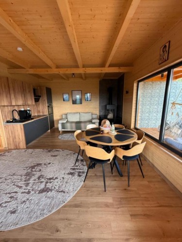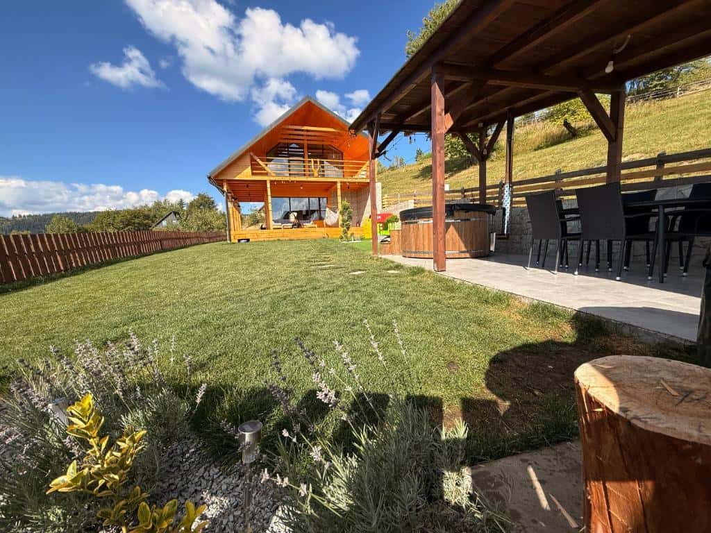 Printre facilitățile cabanei se numără un hamac, zonă de servit masa, leagăn suspendat, smart TV, zonă de grătar, pavilion, curte generoasă și loc de joacă pentru copii.