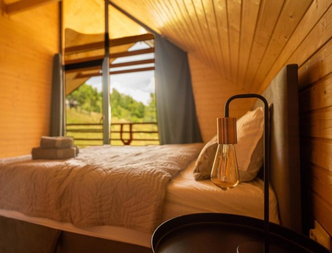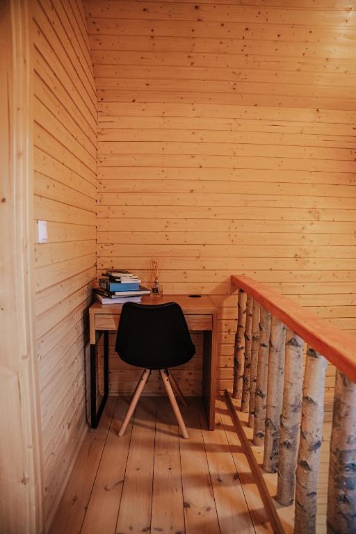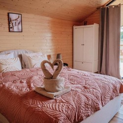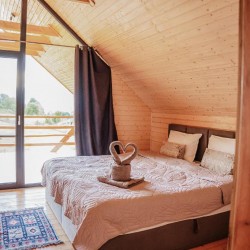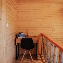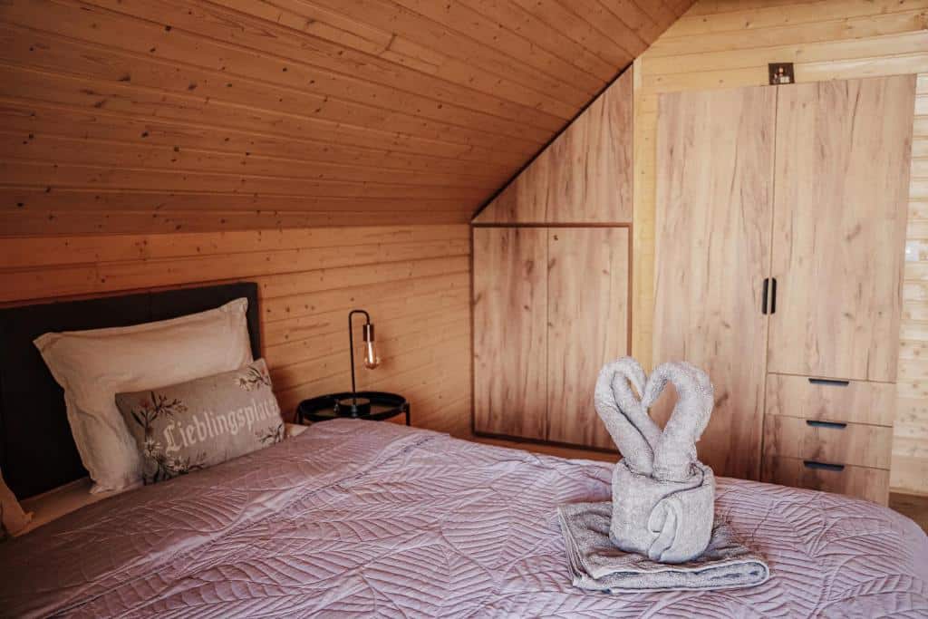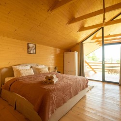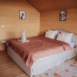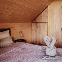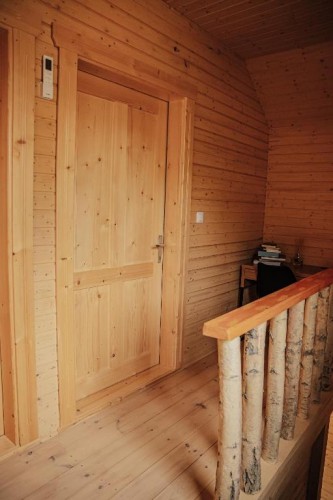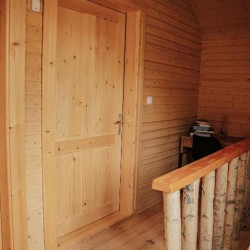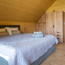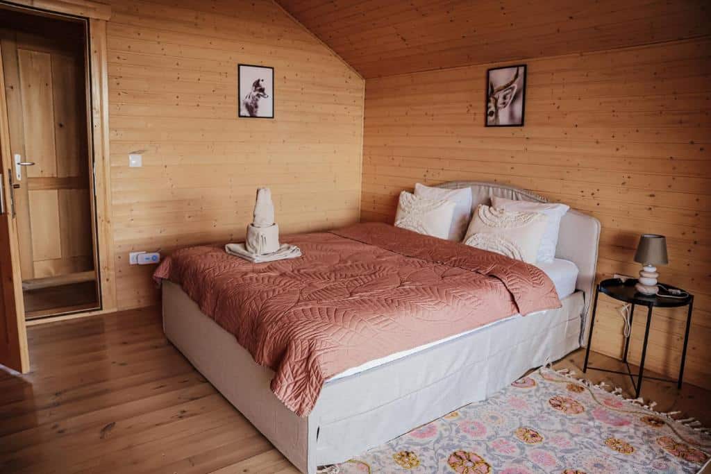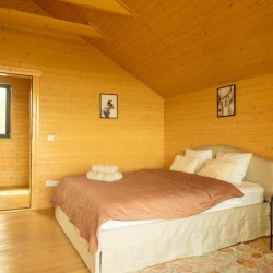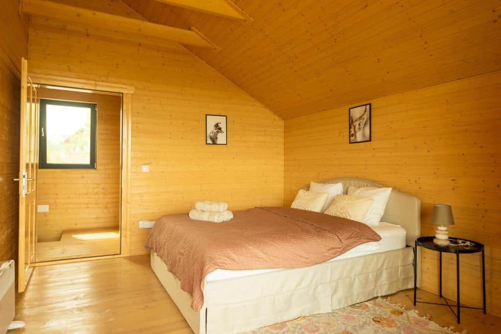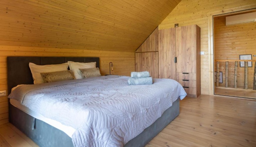 La etaj, cabana dispune de 2 dormitoare matrimoniale cu pat dublu (180×200 cm și 160×200 cm), precum și o baie cu duș.